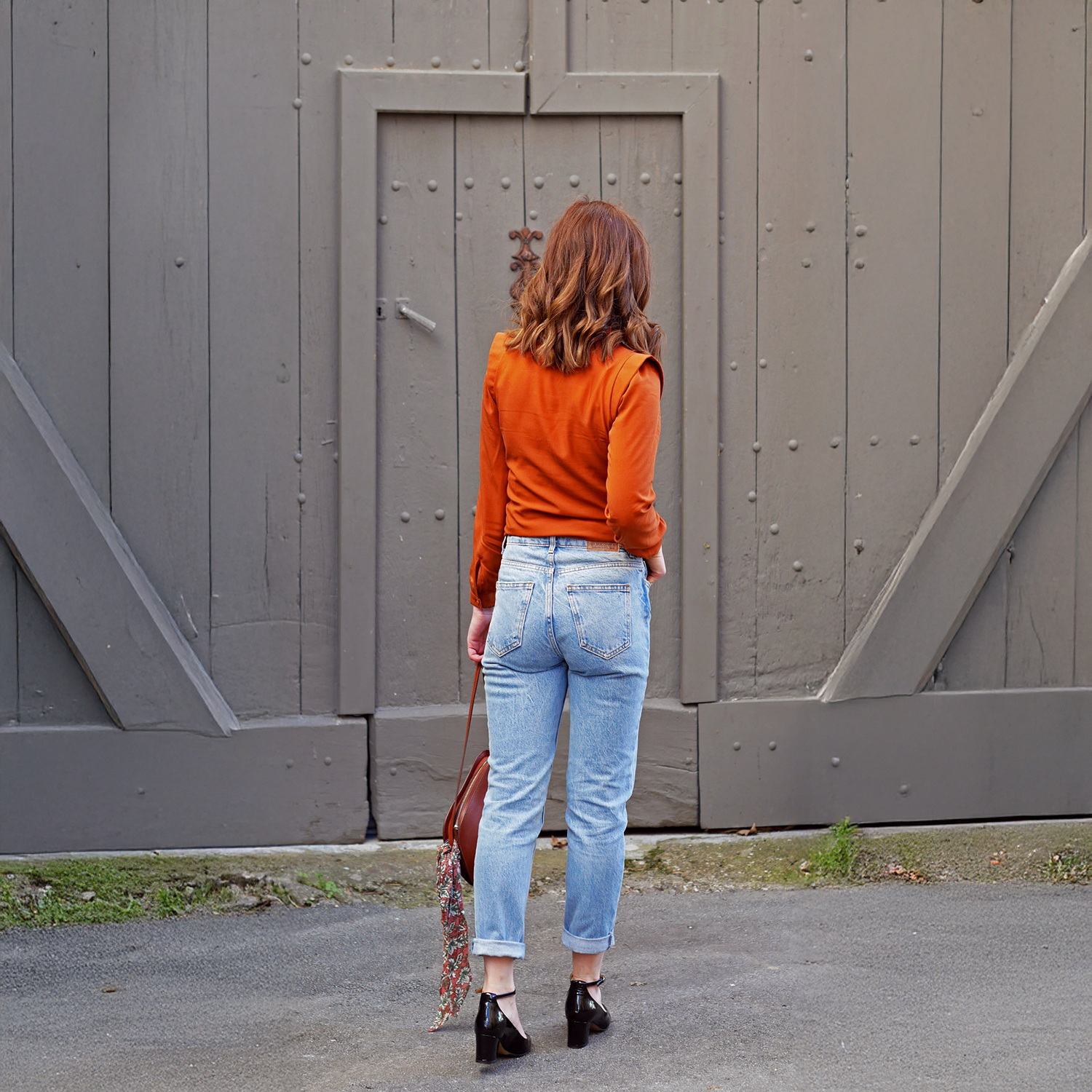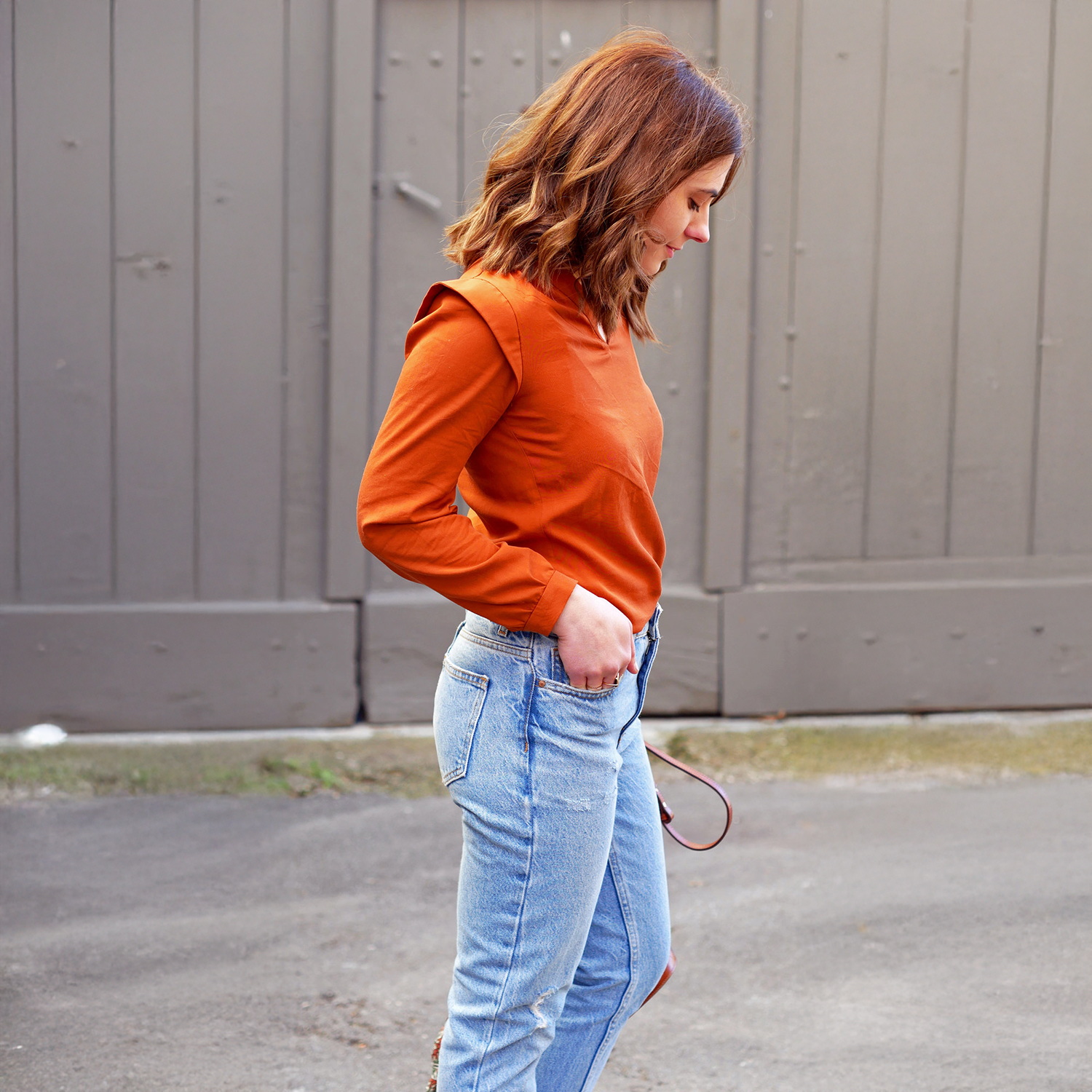 – Un col V façon Teddy : un clin d’œil à la tendance sportswear, qui se marie délicieusement avec l’élégance de cette blouse.
