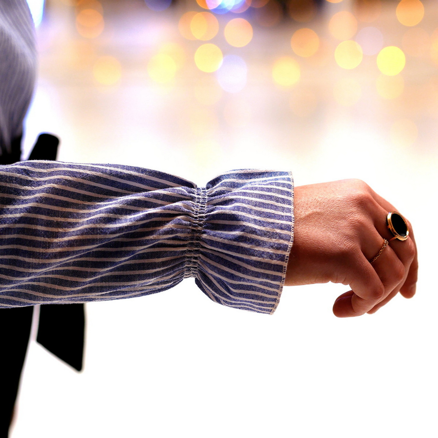 - Manches gigot : Froncées avec élégance, elles soulignent la tombée de l’épaule, et les fronces au poignet ajoutent une touche romantique.