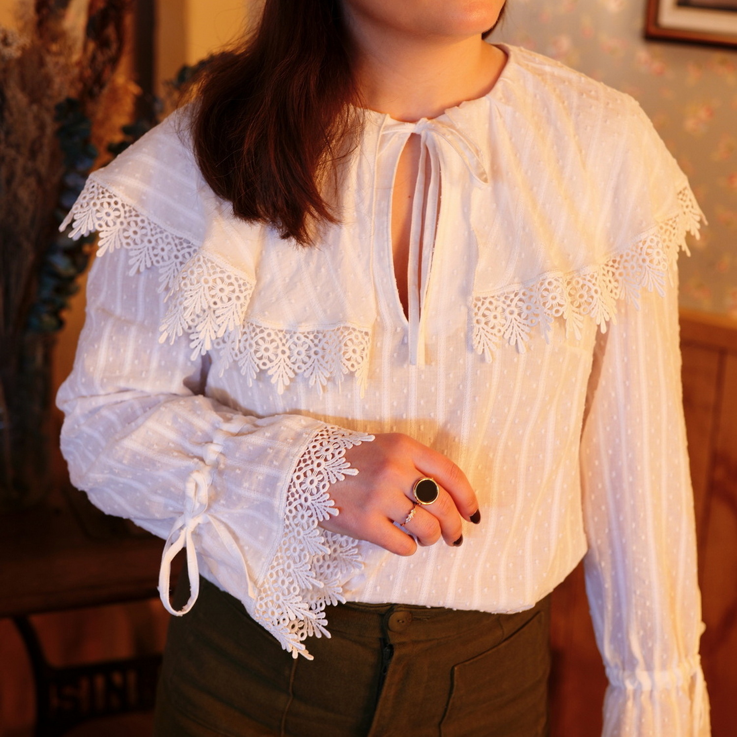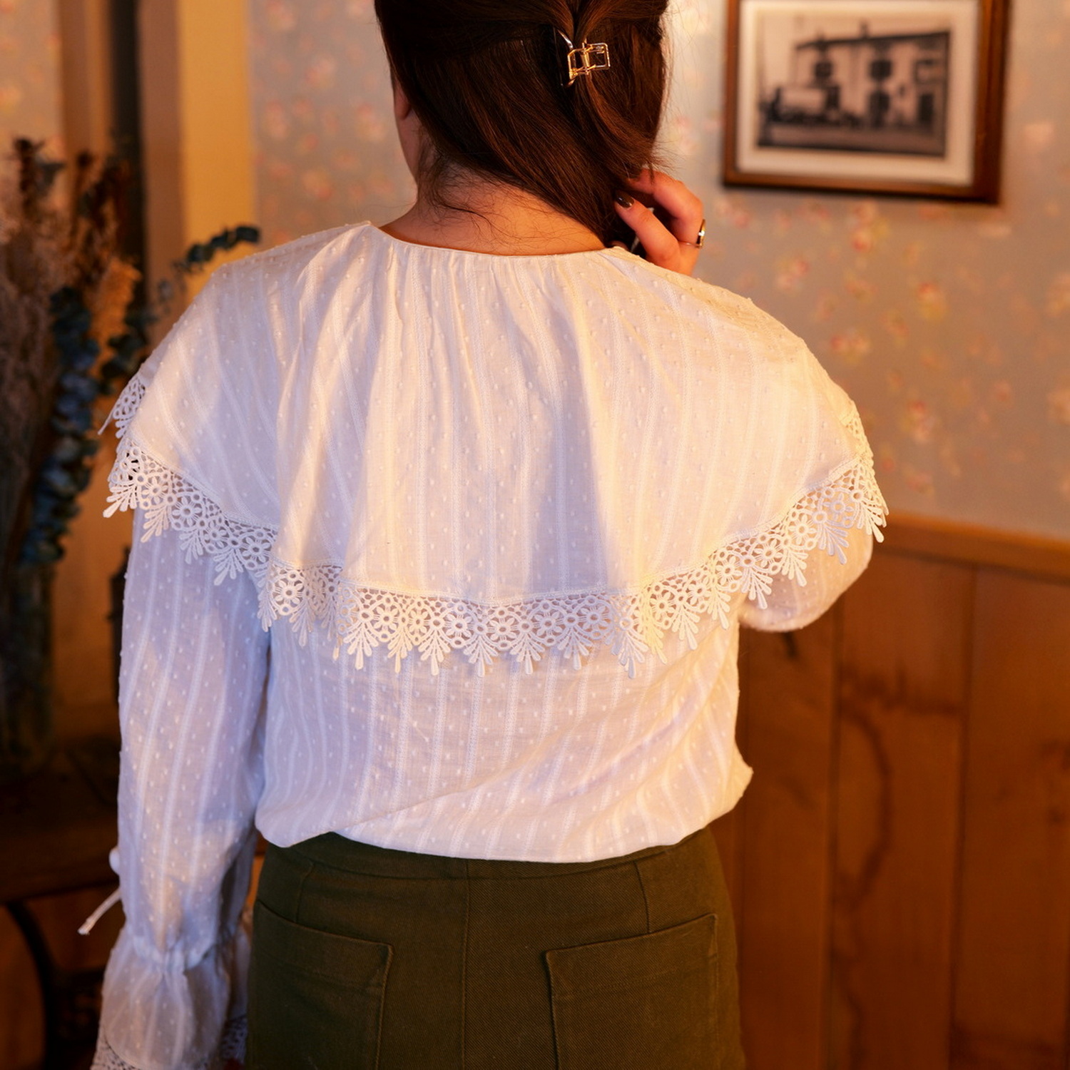 Son col cape est l’élément singulier de cette pièce. Les grandes manches bouffantes resserrées par un lien à nouer et sa fente poitrine se fermant également avec un lien permettent de souligner la délicatesse de la blouse. Des pinces poitrine viennent dessiner la coupe qui s’évase ensuite vers la taille