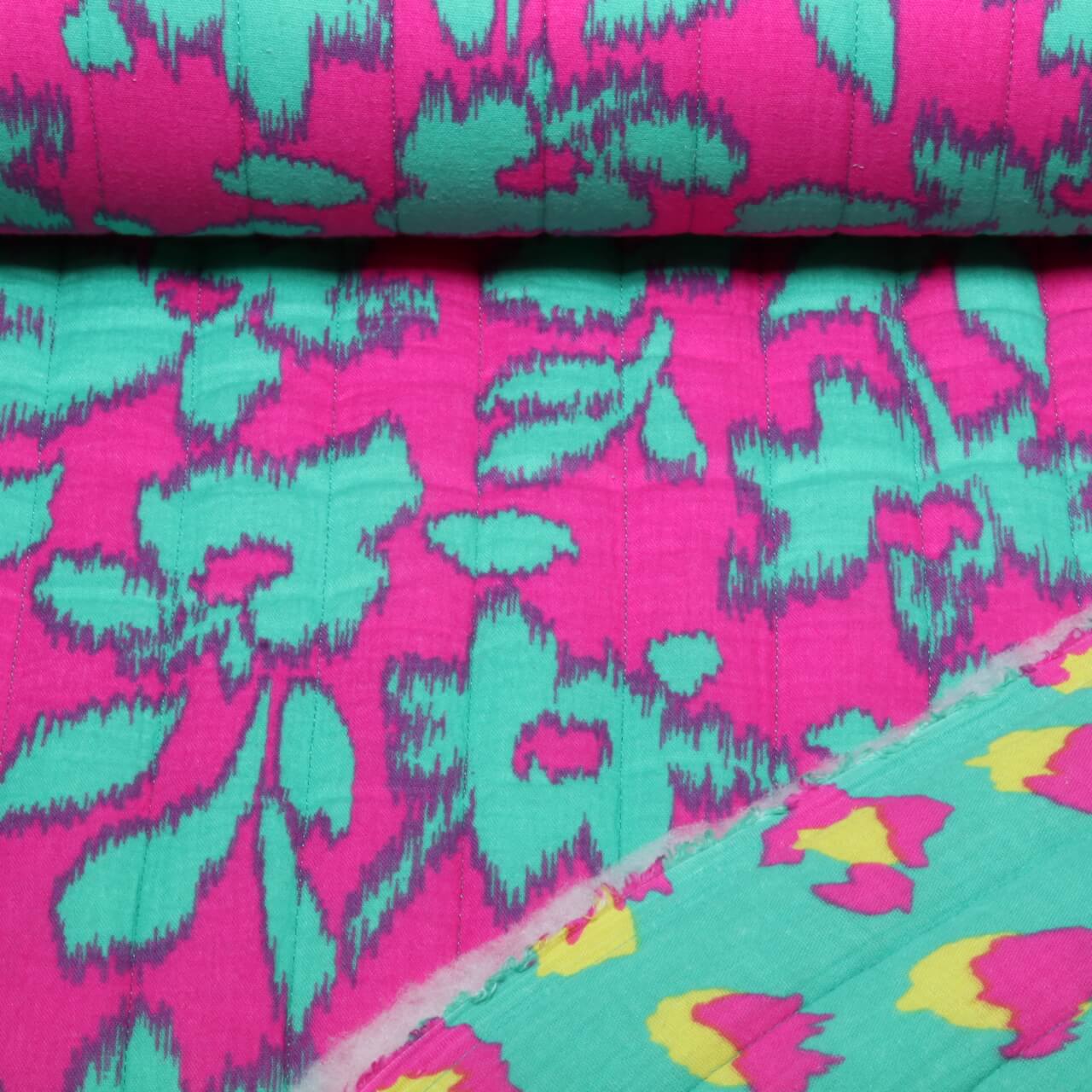 Gaze de coton matelassée - Doubleface Fleurs Vert Impression sur film