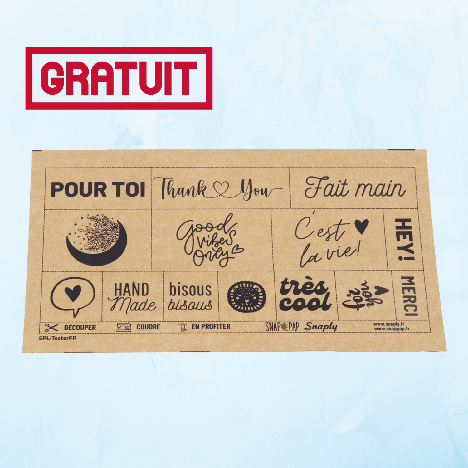 Dès 30 € d'achat, vous recevrez cette feuille d'étiquettes en SnapPap, à découper et à coudre sur vos projets créatifs.