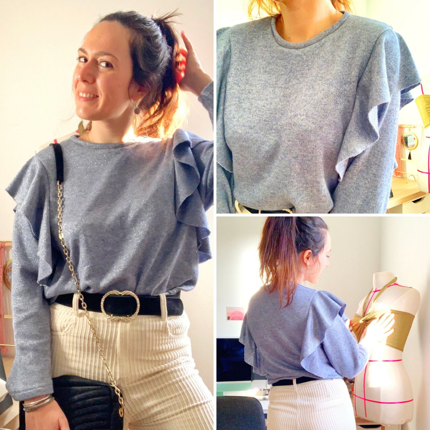 Les volants de manches font l’originalité du modèle mais peuvent ne pas être cousus pour un pull plus classique. Les manches sont amples et longues.