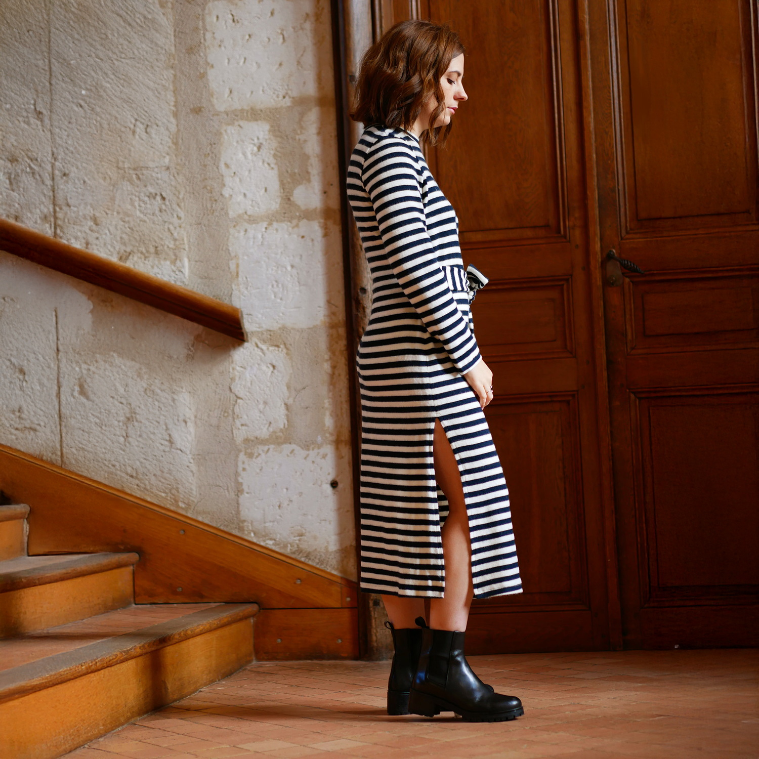 La Robe Calie, c’est la robe maille chic et confortable qu’il vous manquait. Une robe longue s’arrêtant à mi-mollets, une coupe légèrement ample et un col rond qui vous garderont bien au chaud avec style. Son option ceinture à la taille intégrée et ses fentes côtés sur la version longues vous permettront de varier les versions de cet indémodable du dressing. Le petit détail en plus : sa fente en bas de manche qui habille délicatement le poignet.