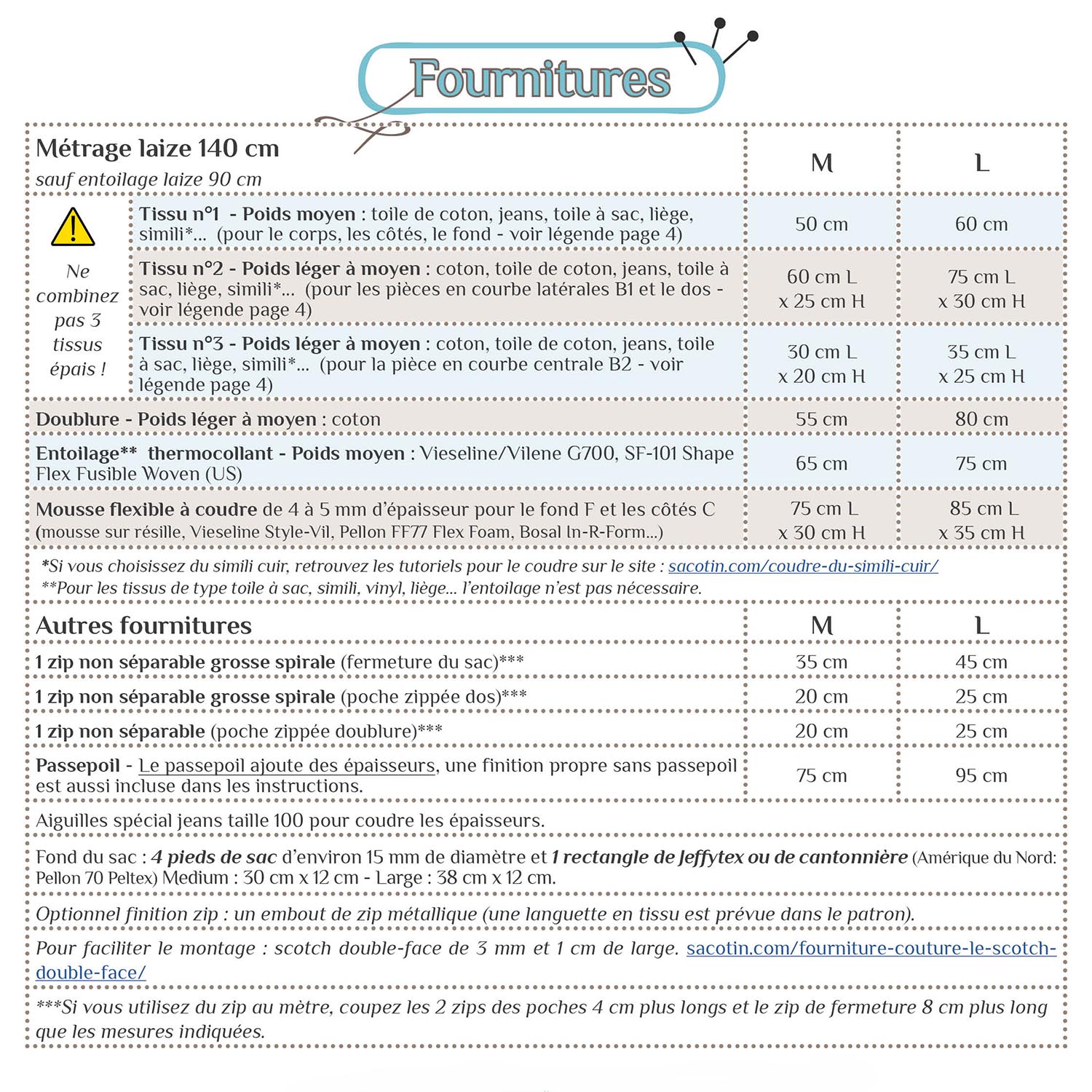 *Pour les tissus de type toile à sac, simili, vinyl, liège... l’entoilage n’est pas nécessaire.