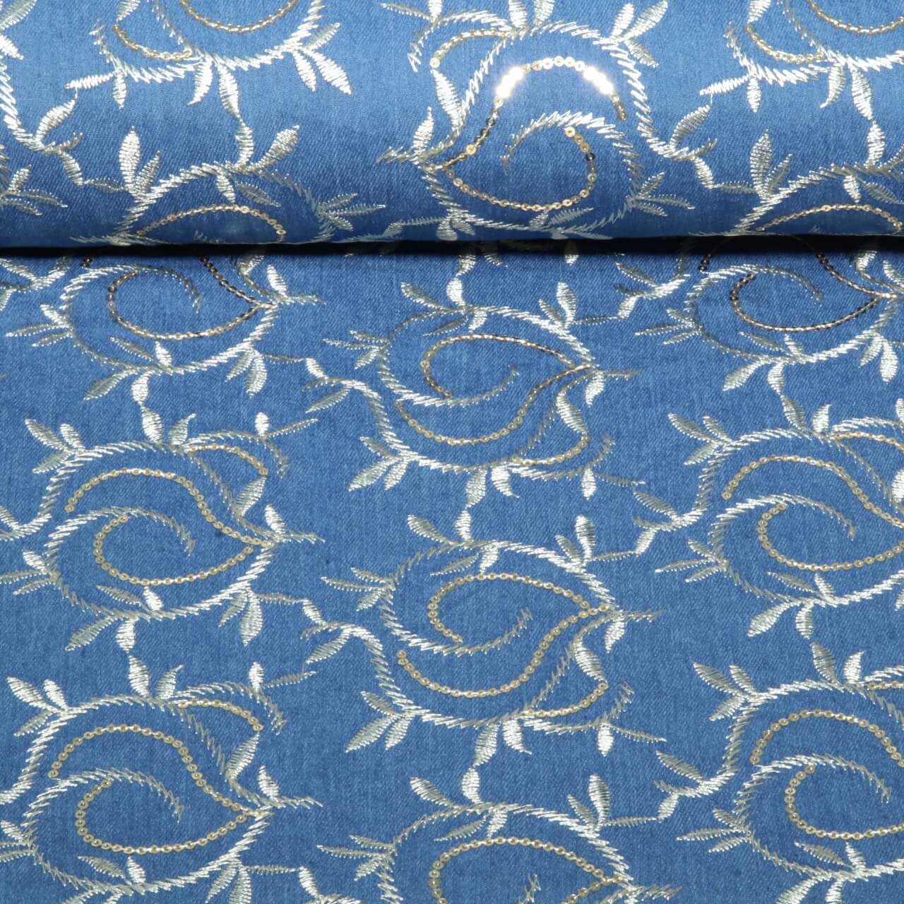 • Tissu jeans pantalon - Stretch feuilles brodées paillettes Bleu indigo-1
