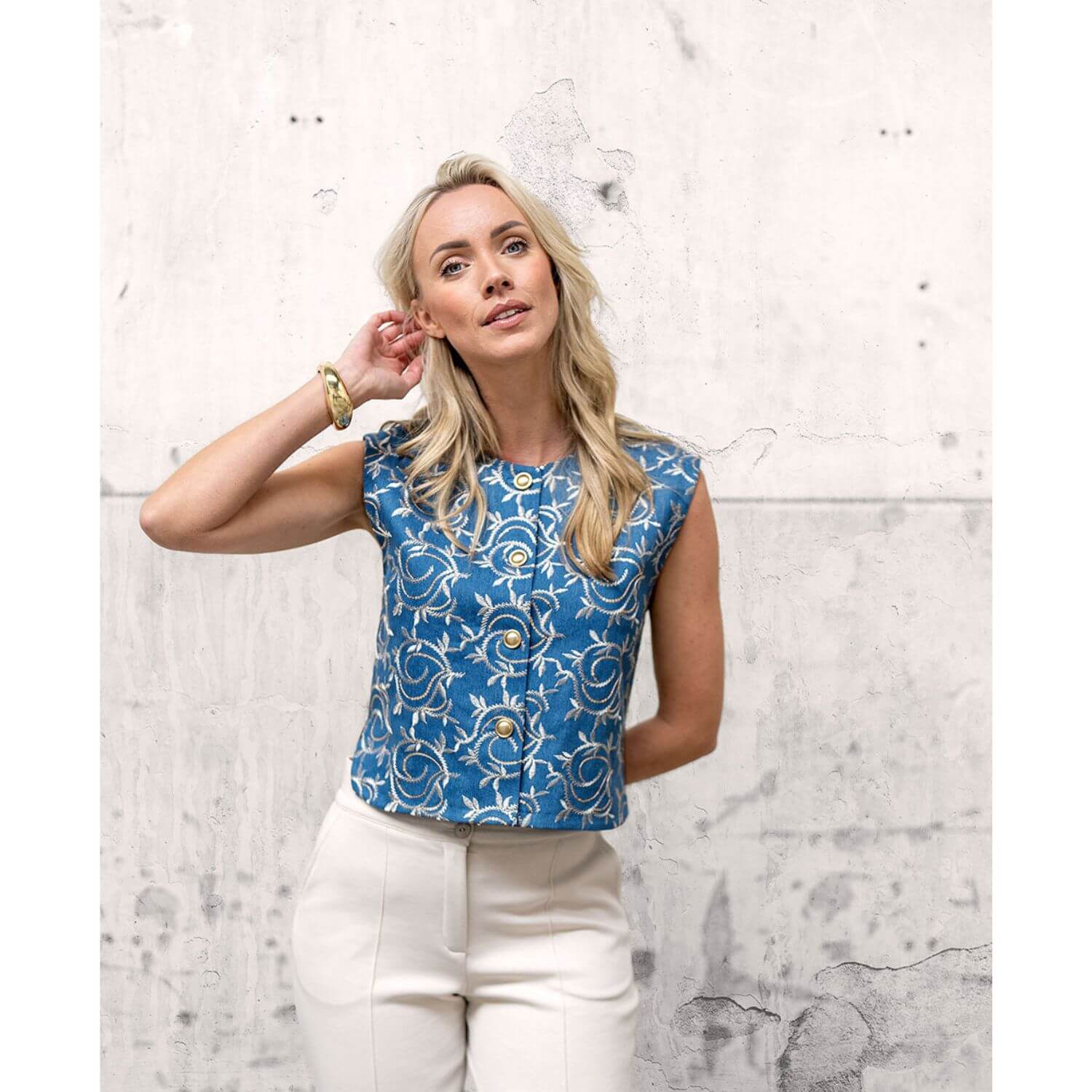 Tissu en jean robuste en Bleu indigo avec des motifs de feuilles brodés de manière élaborée et des paillettes discrètes pour une brillance raffinée. Le tissu de poids moyen offre un toucher agréable et un tombé indéformable pour des projets de couture de longue durée. Idéal pour les pantalons, les jupes, les vestes et les accessoires tendance.