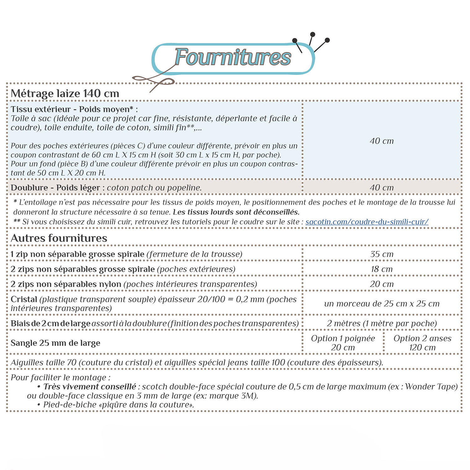 *L’entoilage n’est pas nécessaire pour les tissus de poids moyen, le positionnement des poches et le montage de la trousse lui donneront la structure nécessaire à sa tenue. Les tissus lourds sont déconseillés.