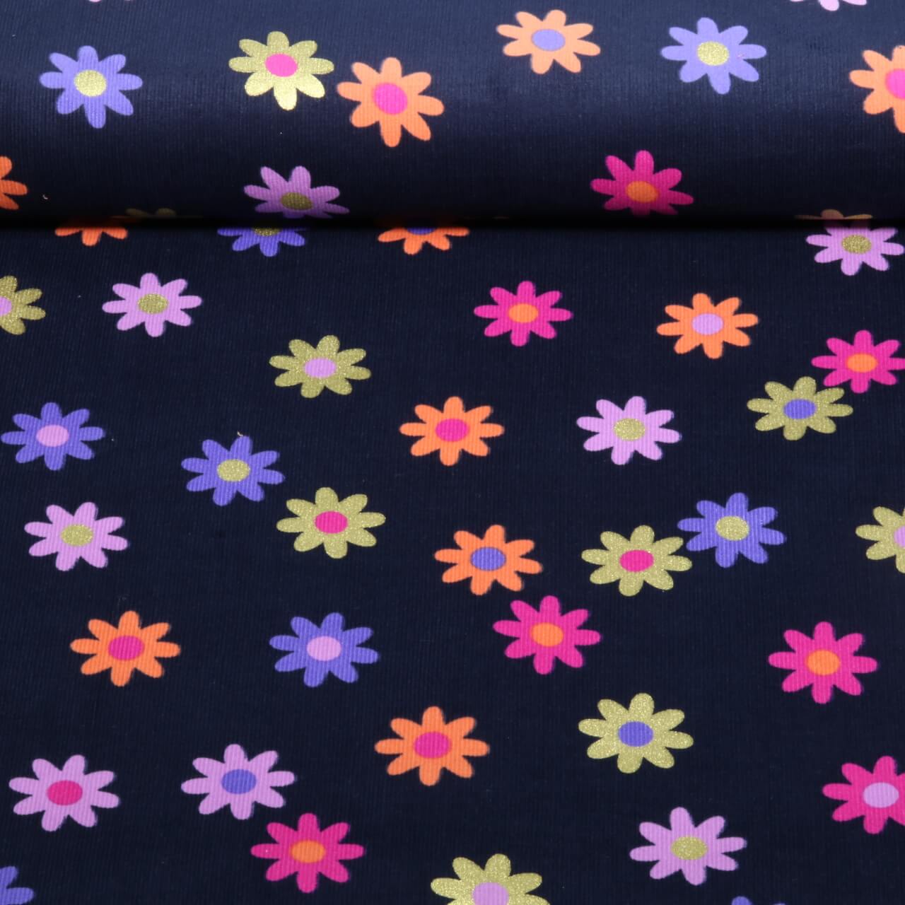Velours côtelé Babycord / milleraies - Petites fleurs Doré Bleu marine foncé