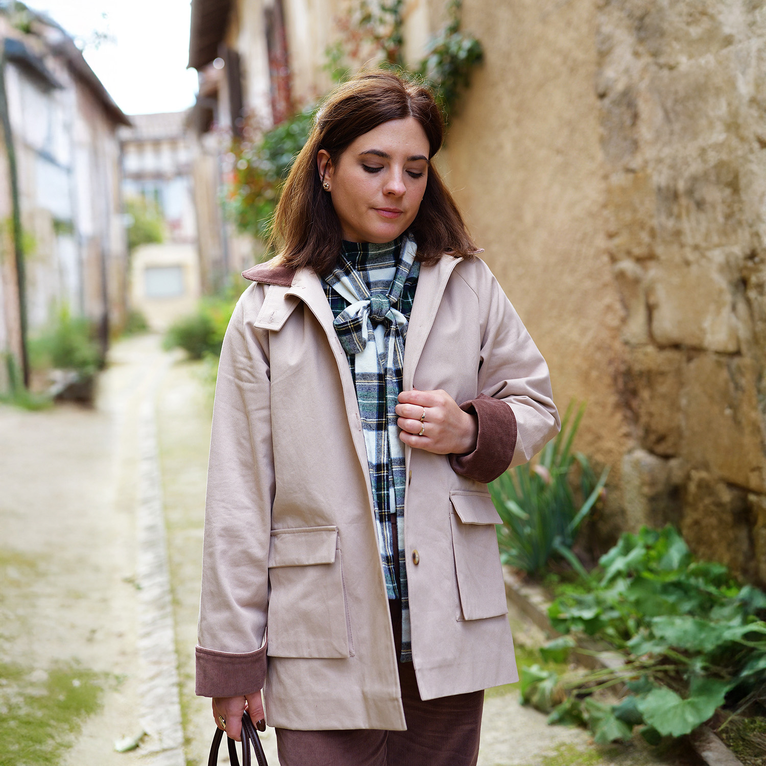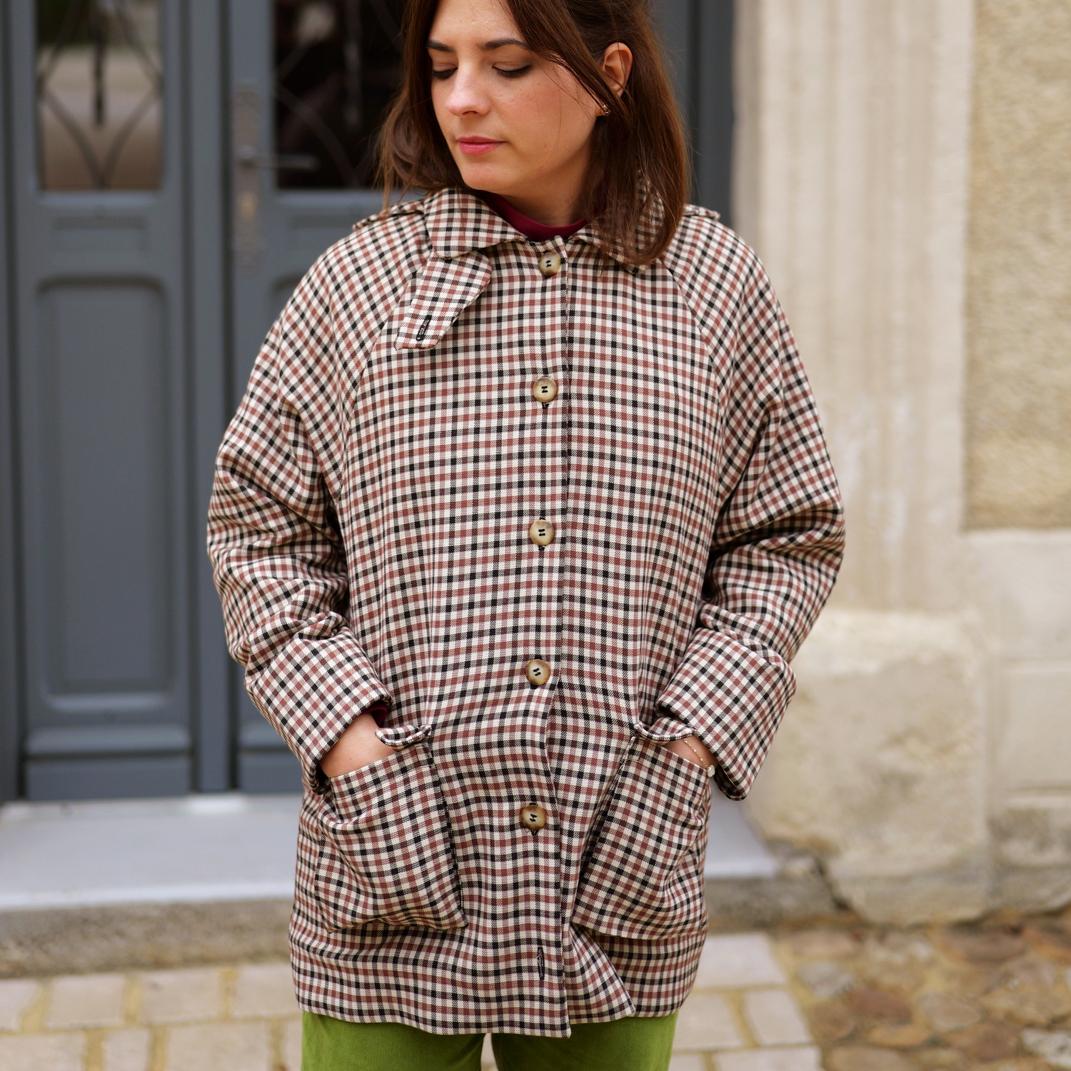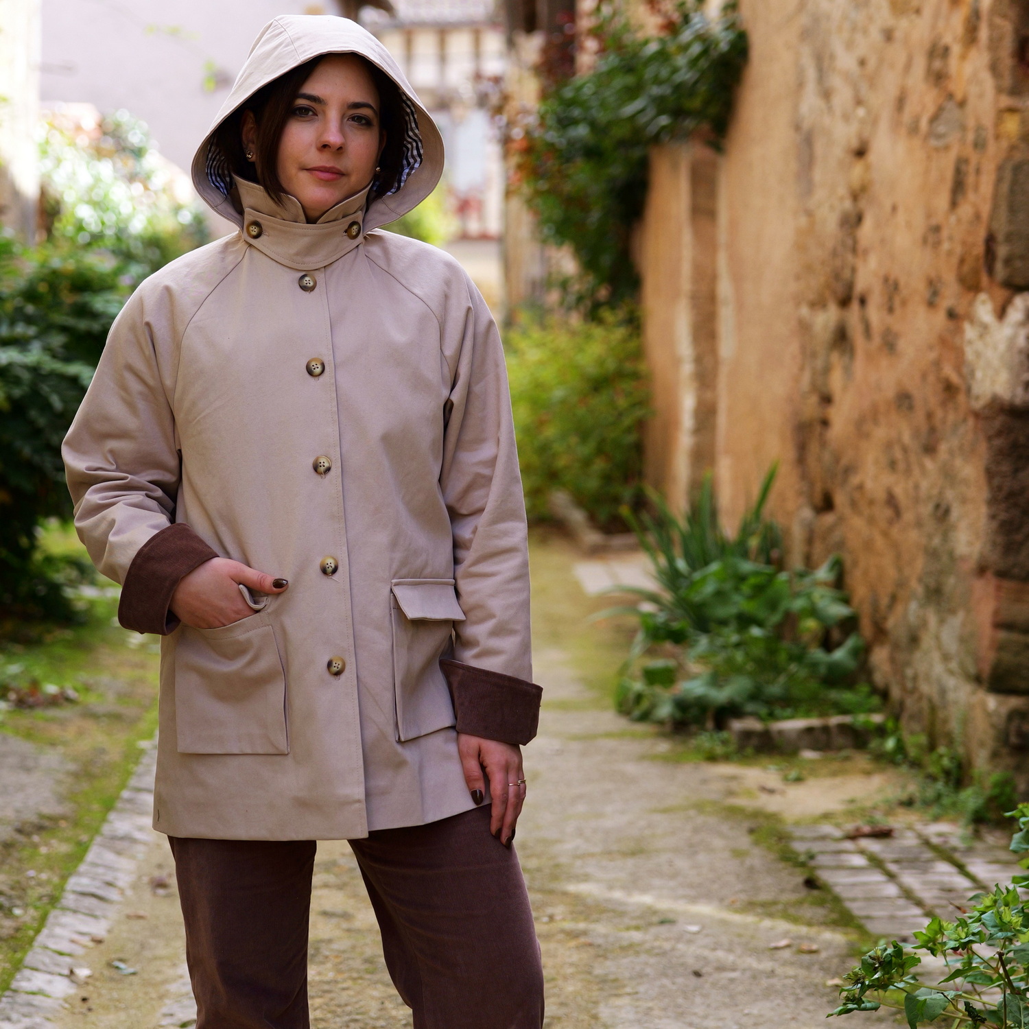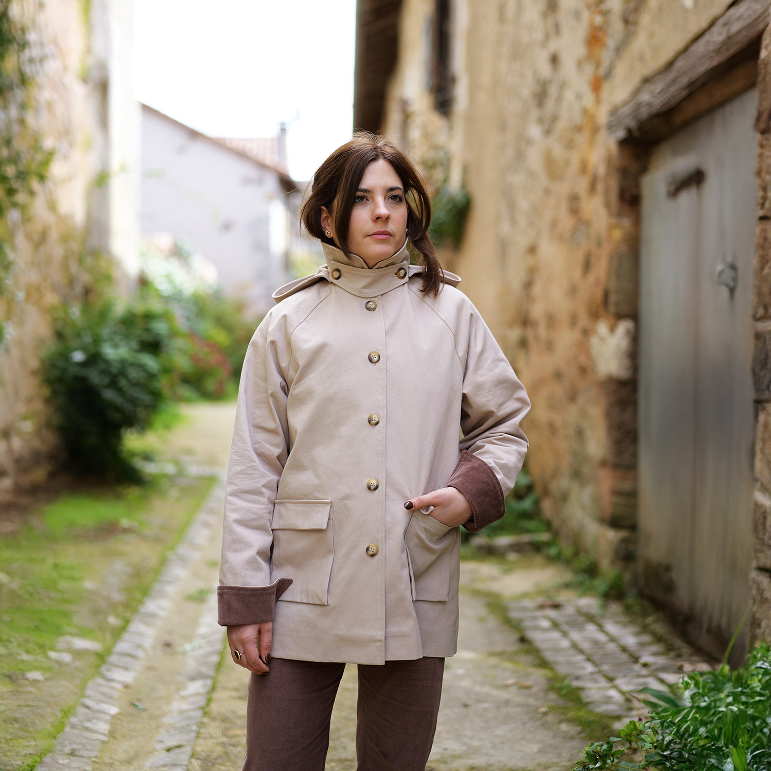 BERGAME c’est la veste versatile à souhait. Tantôt Barn Jacket tantôt parka, elle pourra se coudre dans différents styles et matières. Sa coupe droite boutonnée, ses manches raglan et son col en font la veste typique et intemporelle. Ses poches à soufflets, sa capuche amovible et son cache-cou lui donnent tout son caractère et la rendent multi-fonctions. Deux versions de bas de manches sont proposées : bas classique avec parement ou bas avec revers fendu. Une fente d’aisance au dos apporte style et confort. On peut l’imaginer en gabardine avec col et revers contrastant pour un effet Barn Jacket ultra tendance. Une version avec capuche et cache-cou en tissu déperlant en fera une parka parfaite.